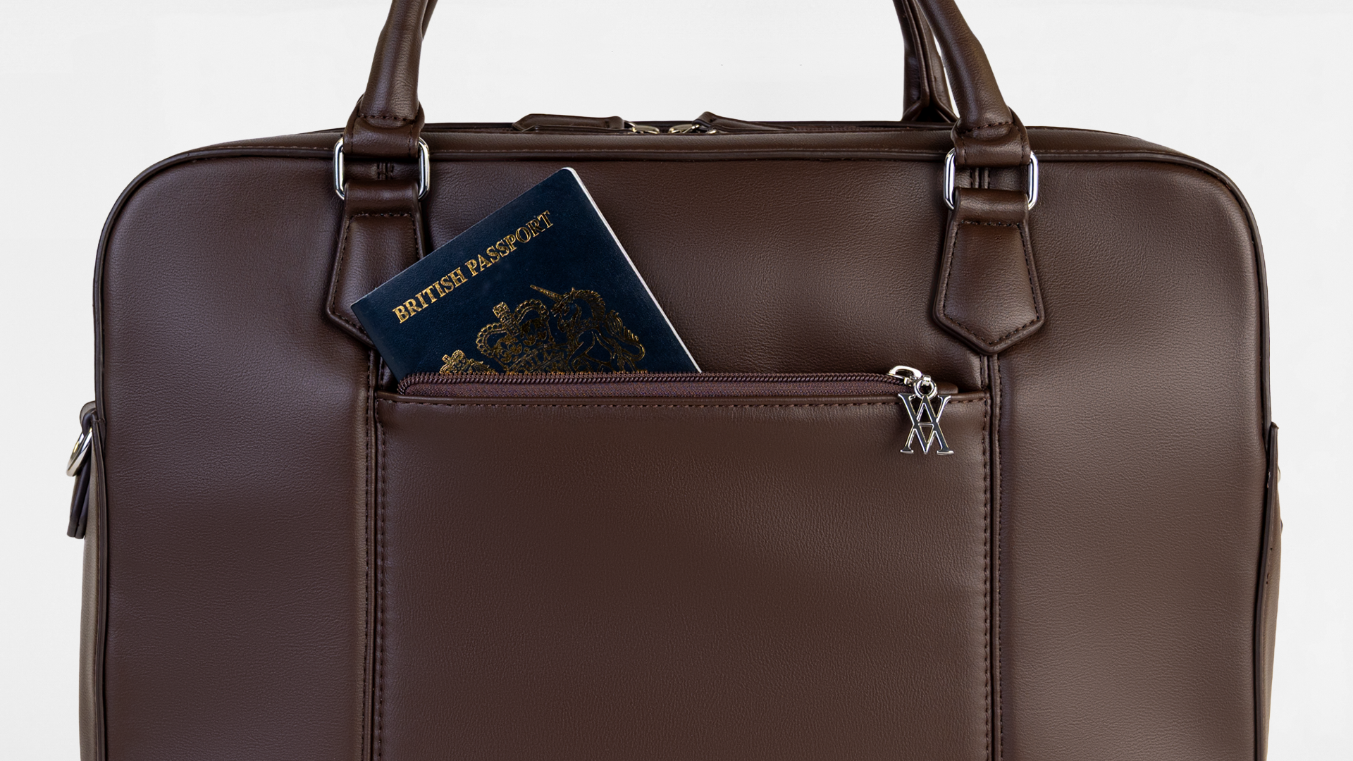 Unlike other briefcases, Berlin features a pocket which slides over your suitcase handle and can keep your passport safe.