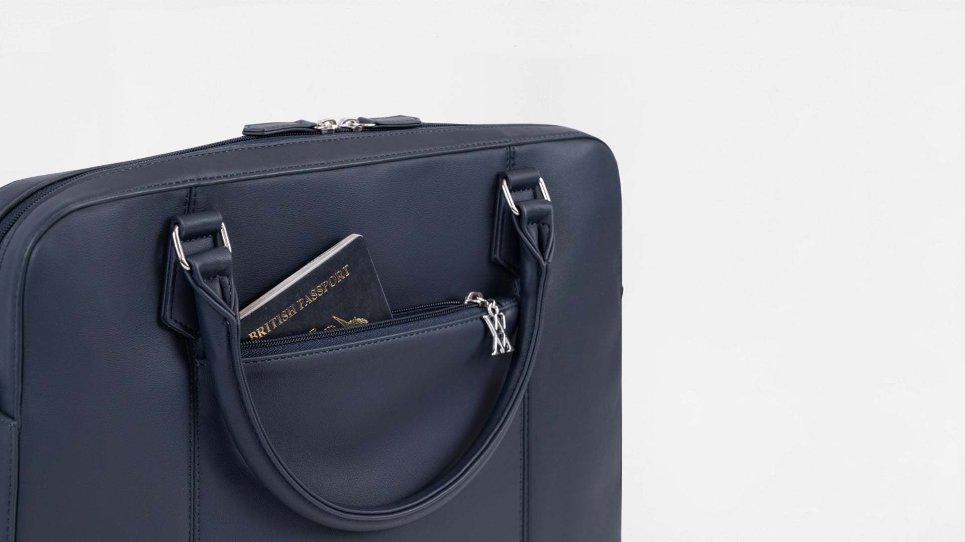 Unlike other briefcases, Berlin features a pocket which slides over your suitcase handle and can keep your passport safe.