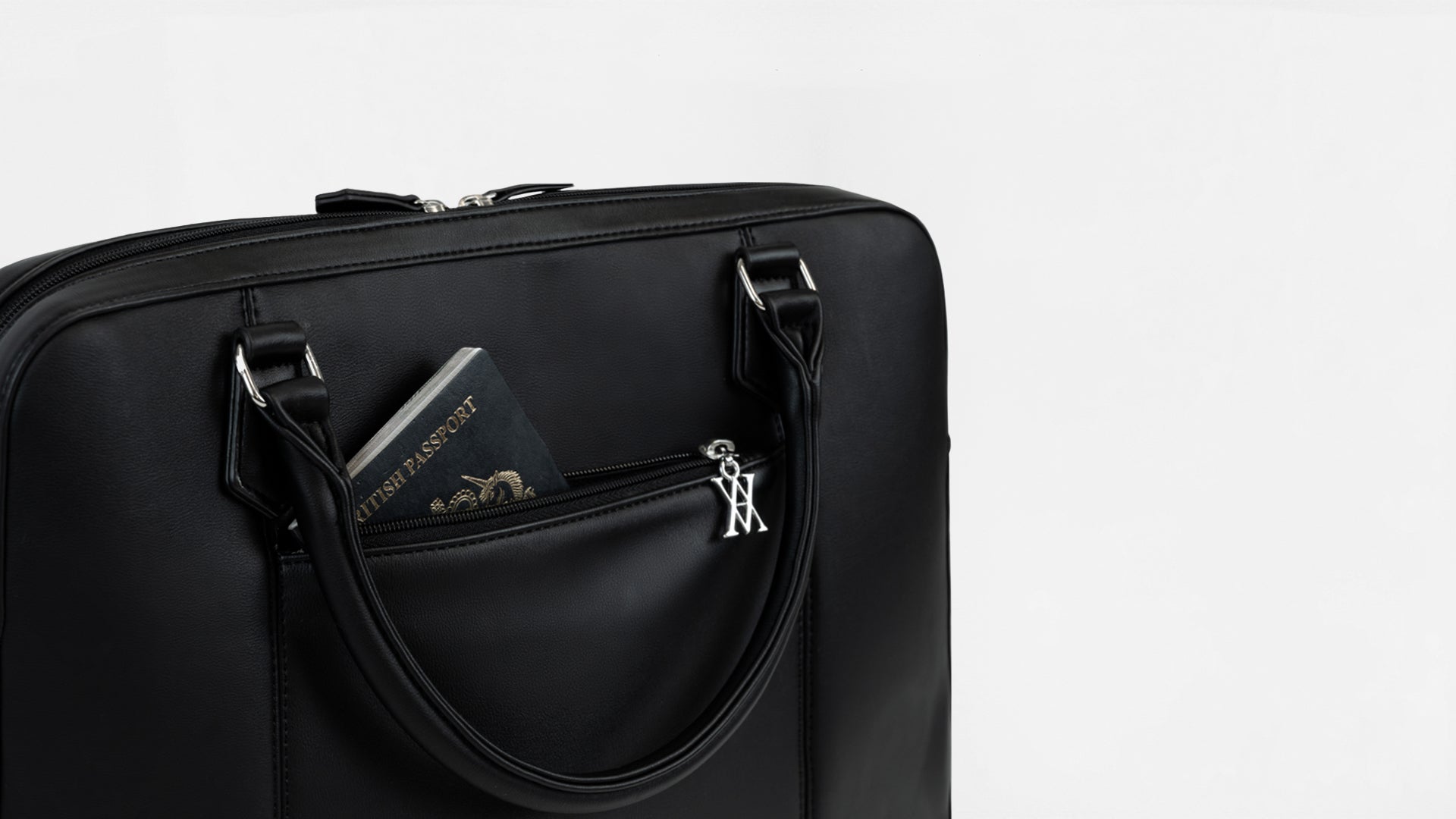 Unlike other briefcases, Berlin features a pocket which slides over your suitcase handle and can keep your passport safe.